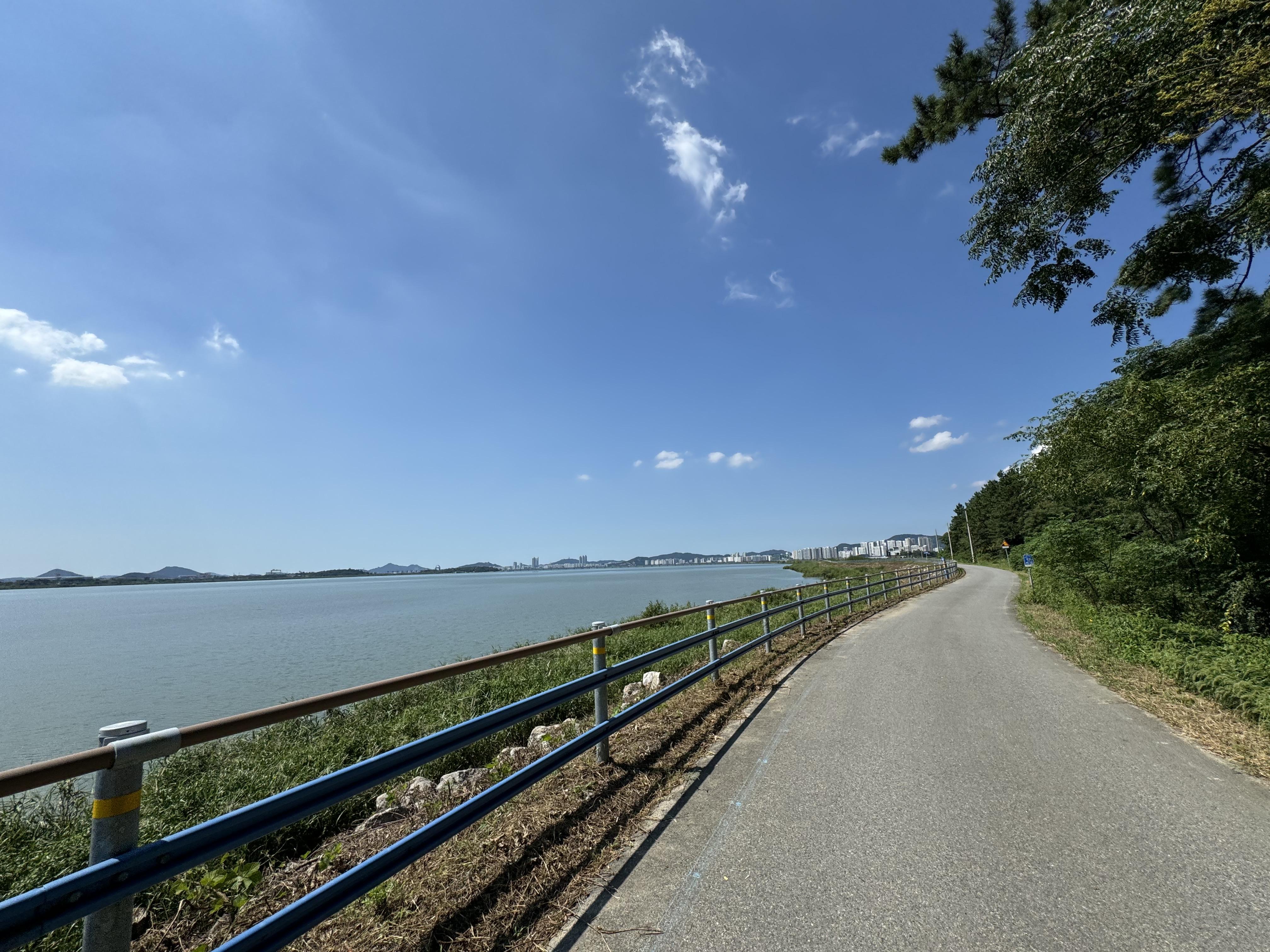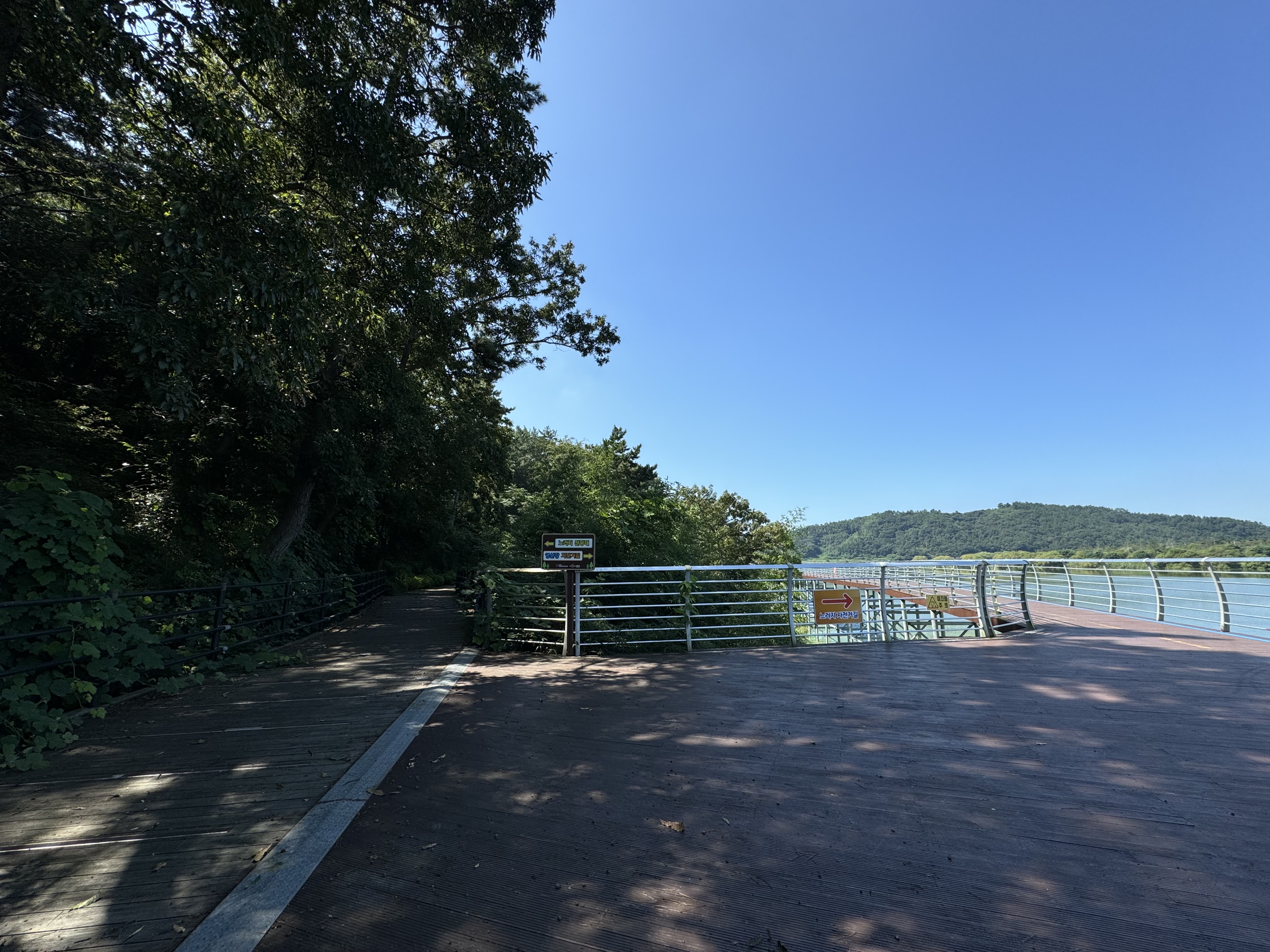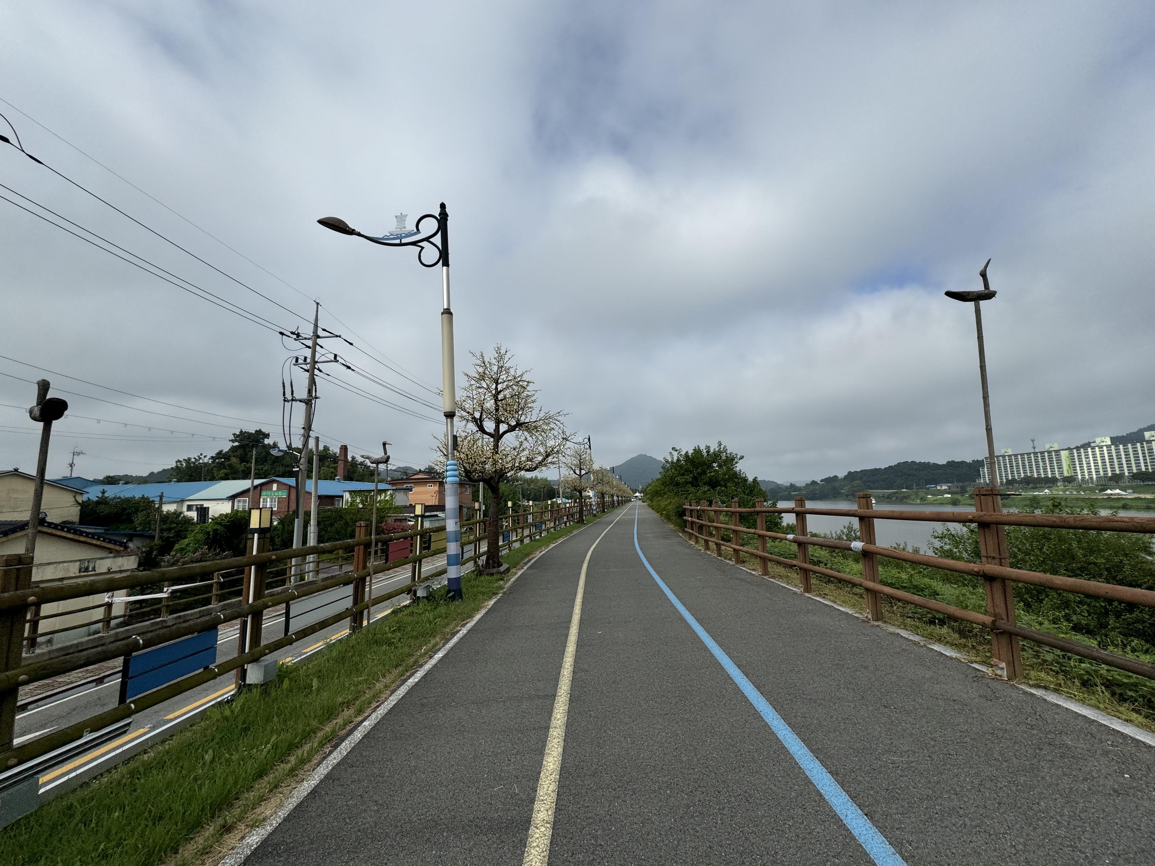 오른쪽으로 갔으면 아마 오르막이 나오던가 아니던가 기억은 잘 안 났지만 하여튼 왼쪽으로 오는 게 맞는 것 같다. 약간은 북한강 자전거길의 춘천에 도착하기 직전에 나오는 의암호의 데크길이 생각나는 길을 달리다보면 오른쪽으로 갔을 때 달려야 하는 길과 합쳐진다. 합쳐지는 곳까지 가니까 아~ 여기! 하고 생각이 났다.
