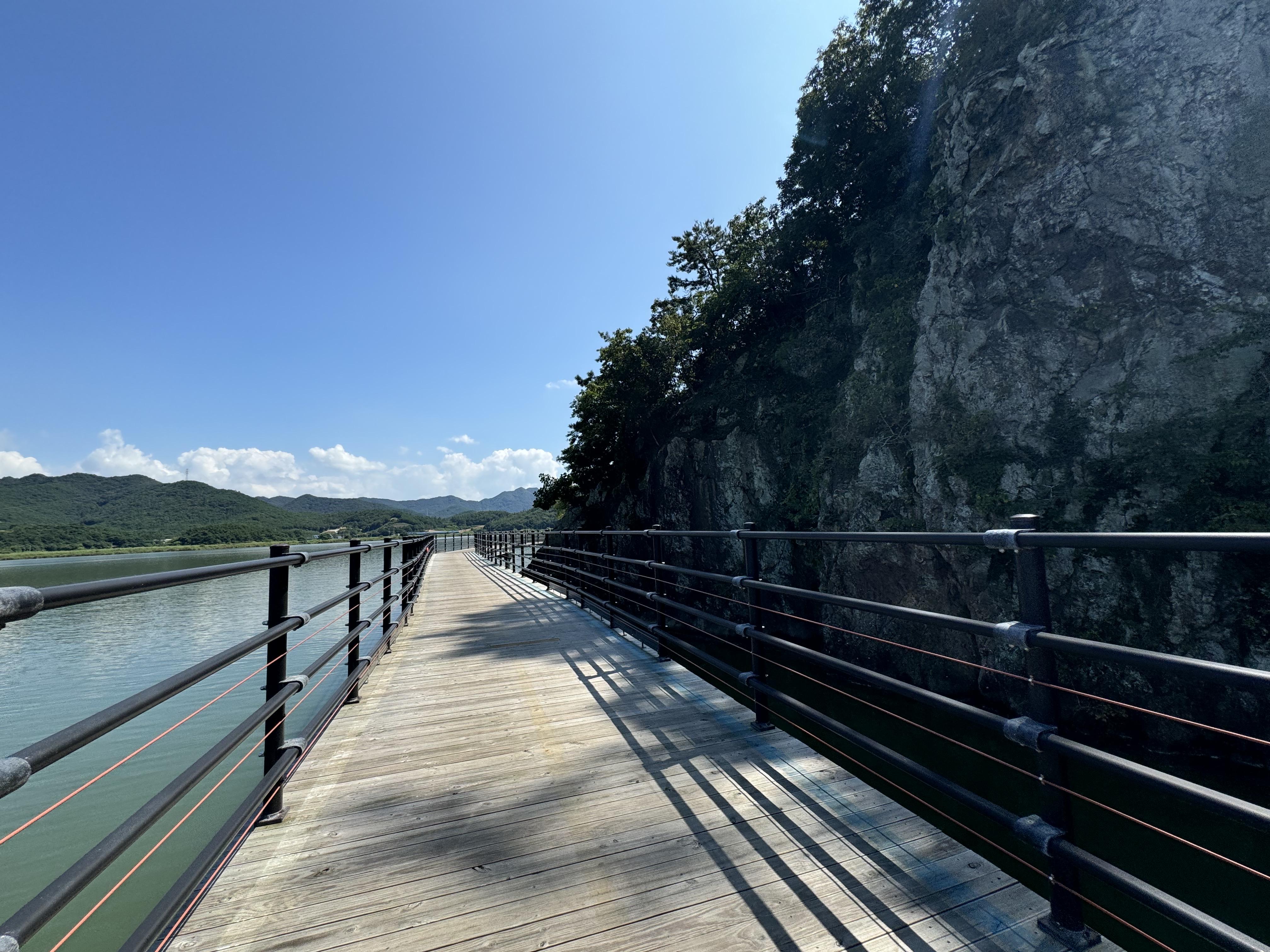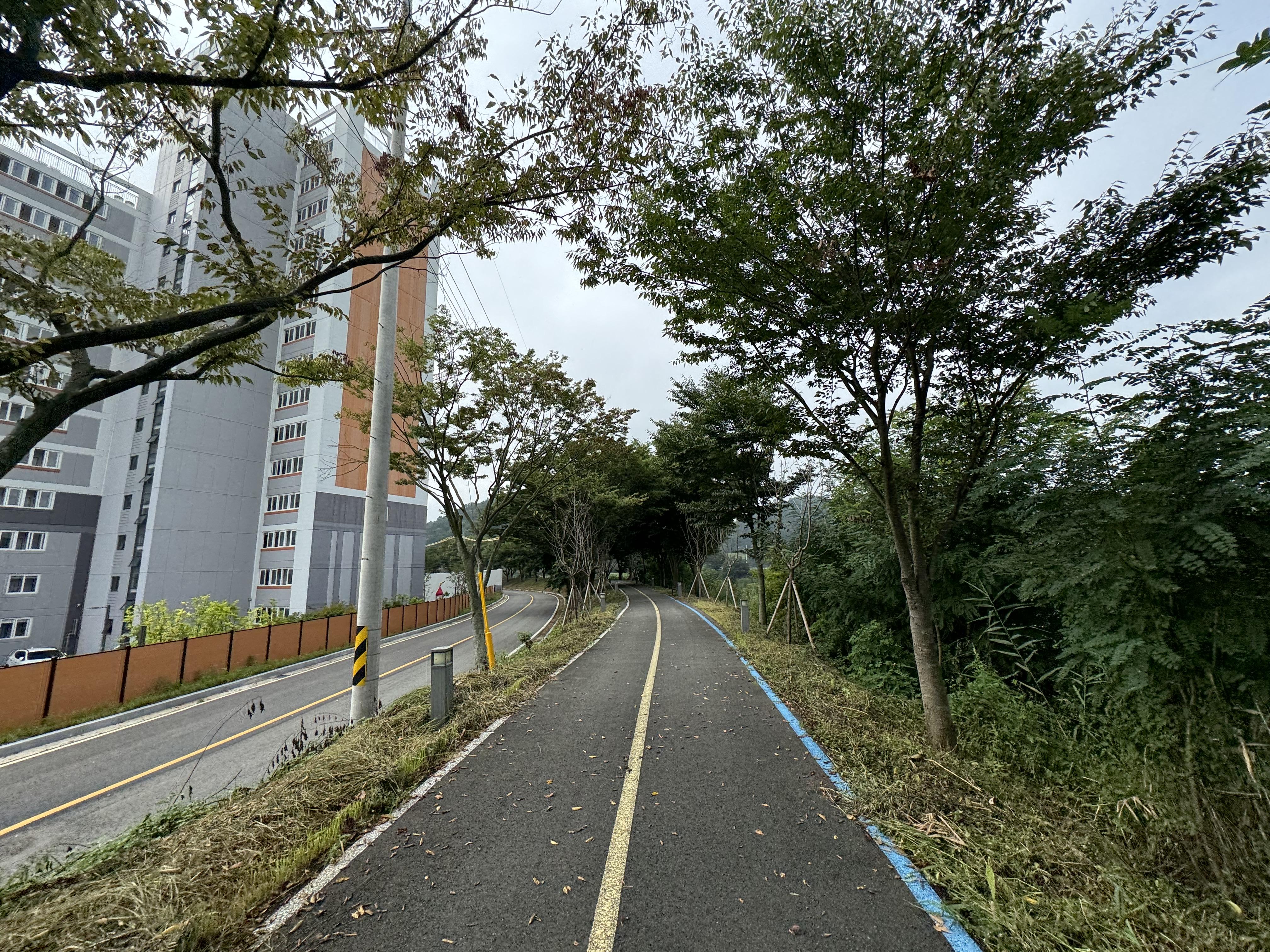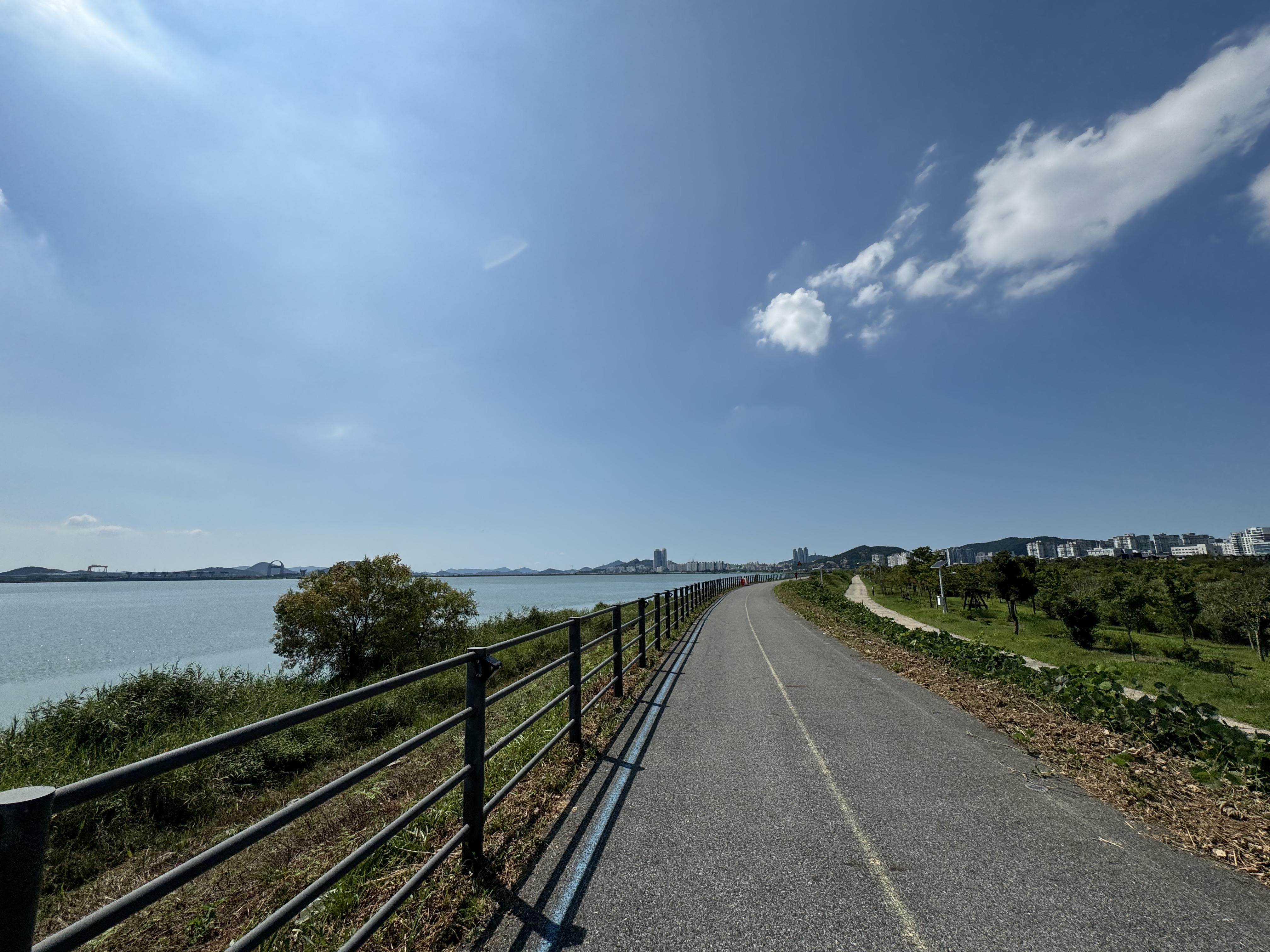 오른쪽으로 갔으면 아마 오르막이 나오던가 아니던가 기억은 잘 안 났지만 하여튼 왼쪽으로 오는 게 맞는 것 같다. 약간은 북한강 자전거길의 춘천에 도착하기 직전에 나오는 의암호의 데크길이 생각나는 길을 달리다보면 오른쪽으로 갔을 때 달려야 하는 길과 합쳐진다. 합쳐지는 곳까지 가니까 아~ 여기! 하고 생각이 났다.