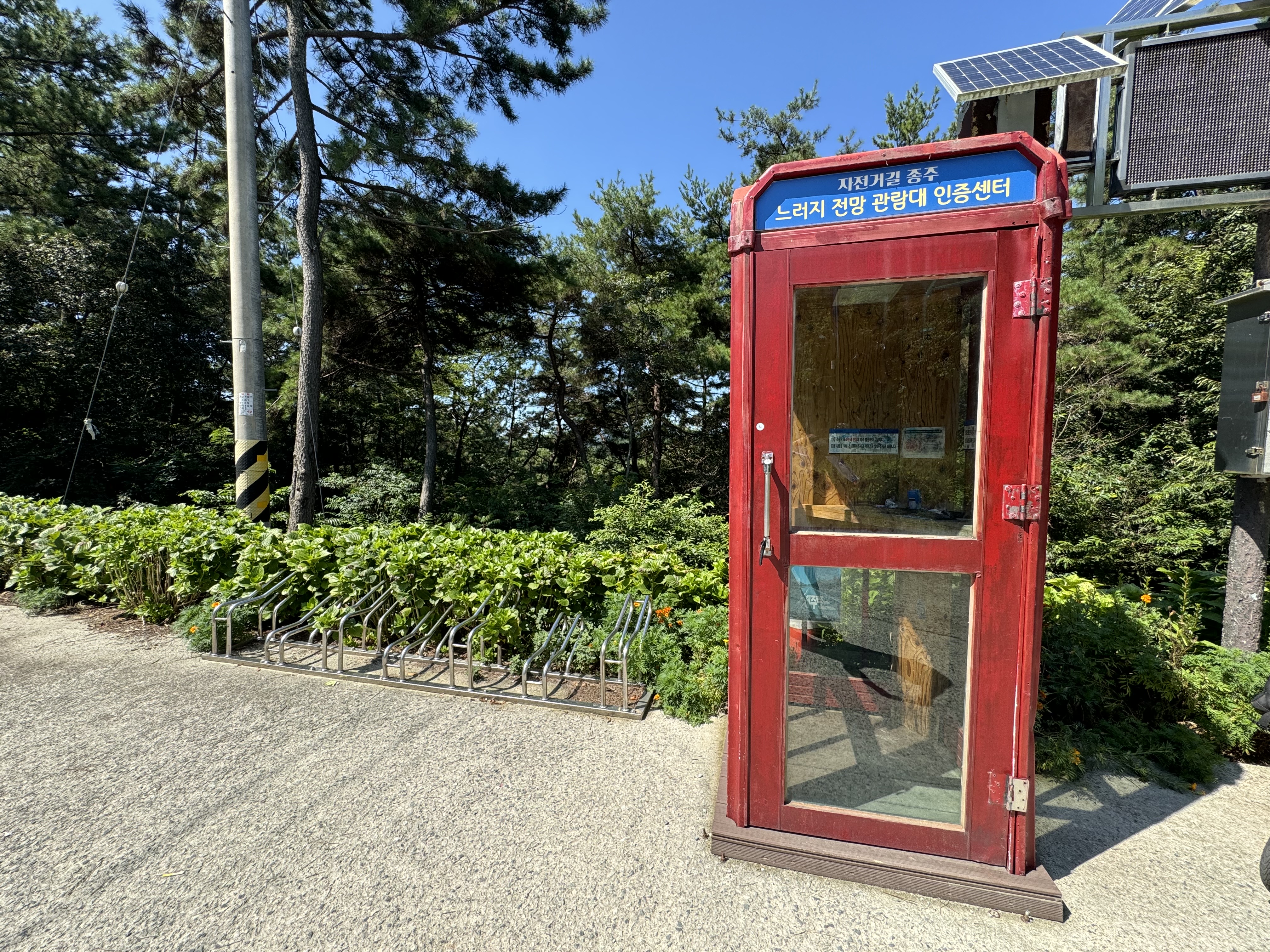 느러지전망관람대 인증센터 부스는 왜 계속 자동으로 문이 닫히는 걸까? 저번에도 궁금했는데 이번에도 궁금증을 해결하지 못 했다. 안 그래도 날이 더웠는데 문까지 닫혀 있으니 도장을 찍으러 들어가서는 아주 쪄죽을 뻔 했다.