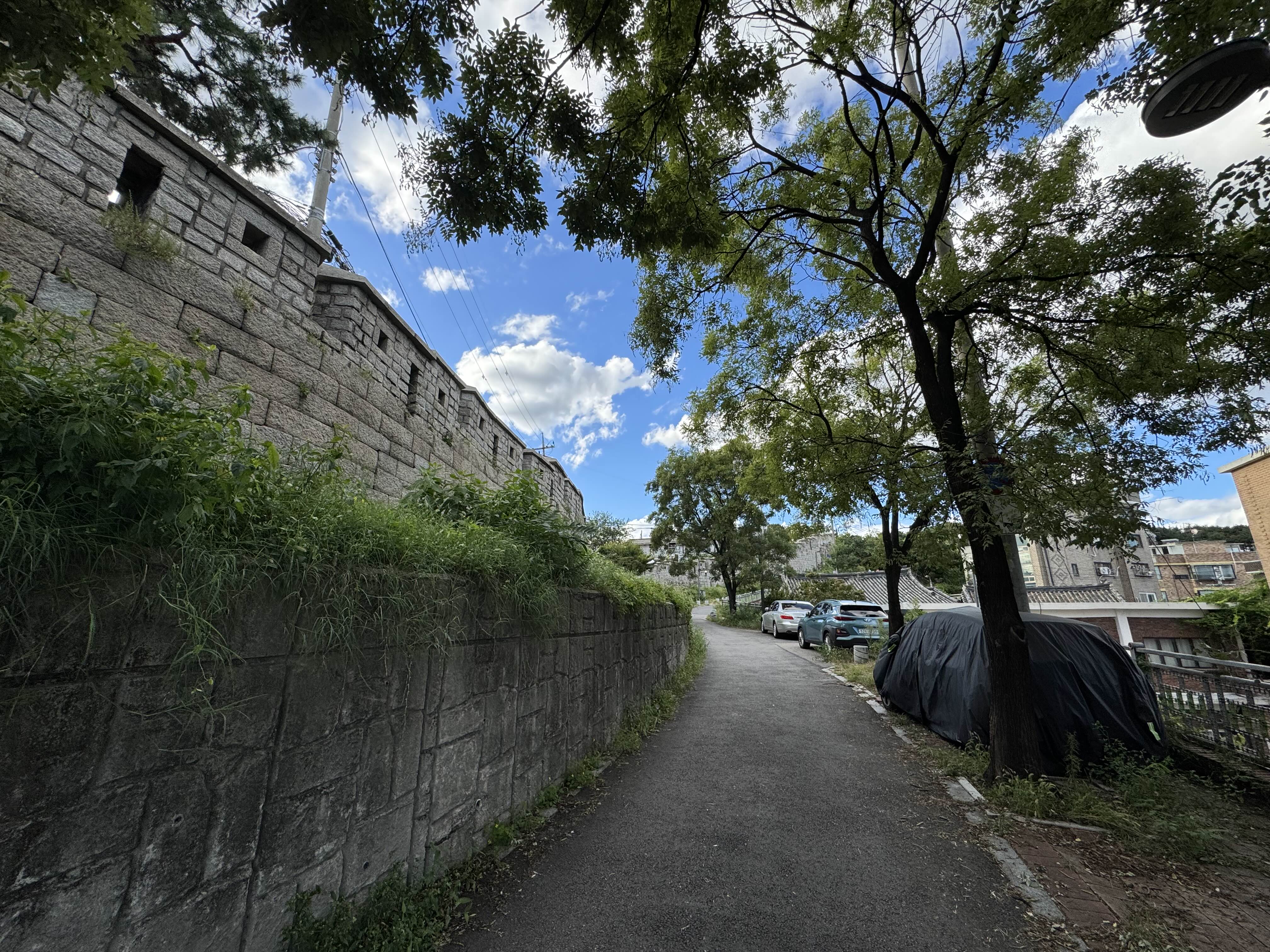빵을 먹으면서 5분 정도 휴식을 취하고 한양도성 순성길 인왕산 구간 스탬프를 찍는 곳인 돈의문 박물관마을로 다시 발걸음을 옮겼다. 이 쪽 길은 뭔가 골목길을 지나가는게 기분이 좋아지는 구간이다. 강북삼성병원에 도착하기 조금 전에 있는 잔디와 함께 어우러져 있는 성벽도 볼 때마다 너무 멋있어서 자꾸만 보게 된다.