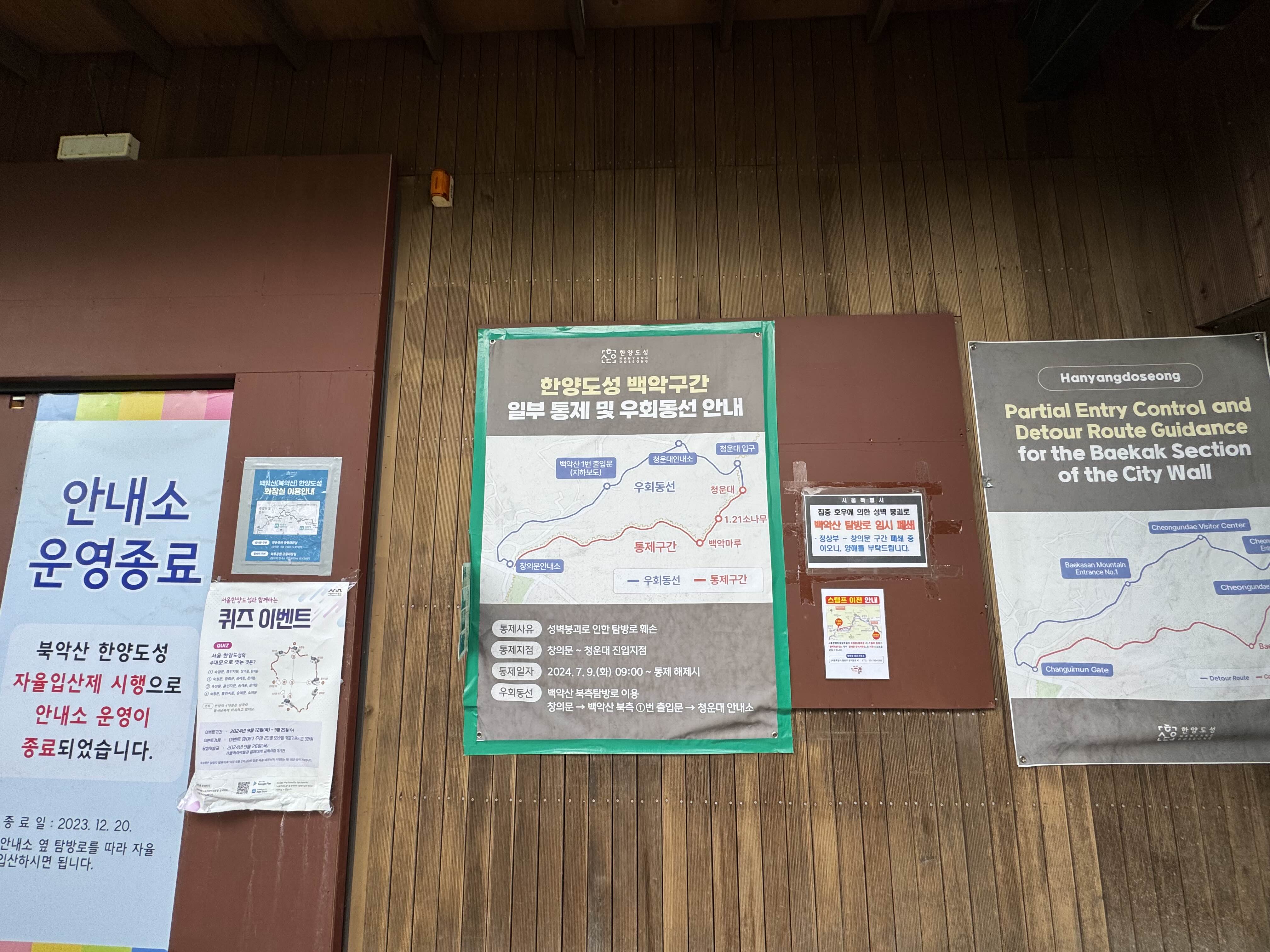 한양도성 순성길의 백악산 구간 중 일부 코스가 저번 장마로 인해 유실 되어서 우회를 해야 한다고 했는데 어디 쯤에서 우회를 하는 건지 열심히 긴장을 하고 있었는데 그럴 필요까지는 없었다. 첫 번째 우회 안내문구가 백악산 구간에 들어서고나서 꽤 이른 시점에 나와서 이 근처에서 우회를 하는 건가 싶었는데 그냥 여기다가 적어두자면 청운대 비석까지는 그냥 올라가면 된다.