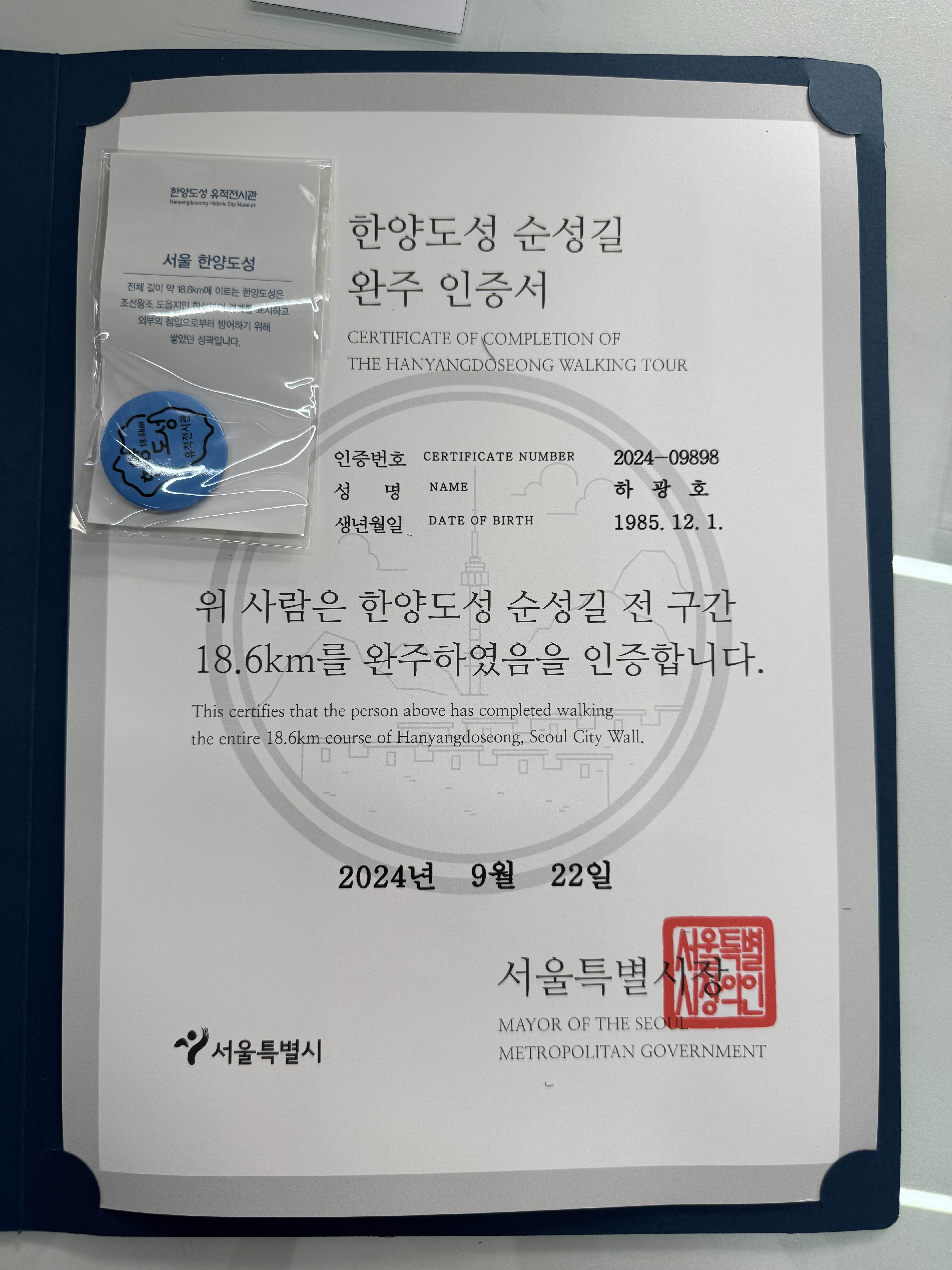 그리고 사무실에 도착한 게 17시 3분이었다. 내 뒤로도 몇 분 정도가 더 오셨는데 여자 직원 분이 다음부터는 17시까지 오시라고 계속해서 안내를 하고 계셨다. 근데 한양도성 순성길을 완주하고 여기 사무실에 오는 것도 이번이 세 번째인데 올 때마다 생각하지만 인증을 해주시는 남자 직원 분은 참 친절하신 것 같다.