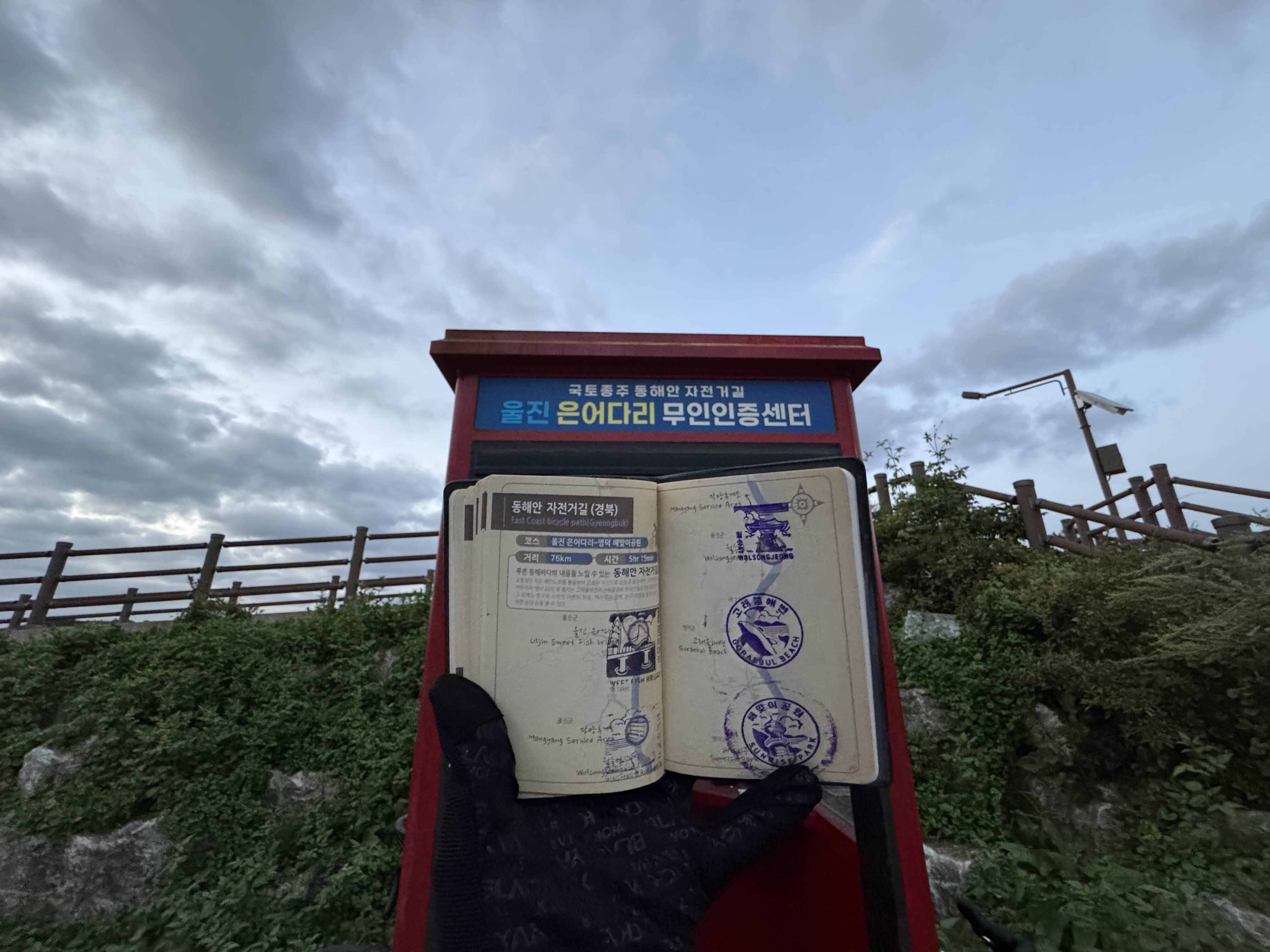 그렇게 해가 지기 전에 도착하겠다는 일념 하나로 죽어라 달렸더니 이제까지의 동해안 종주 중에 가장 밝을 때 울진은어다리 인증센터에 도착할 수 있었다. 울진은어다리 인증센터에 도착해서 도장을 찍고 있으니 다시 같은 버스를 타고 오신 분들도 만날 수 있었다.