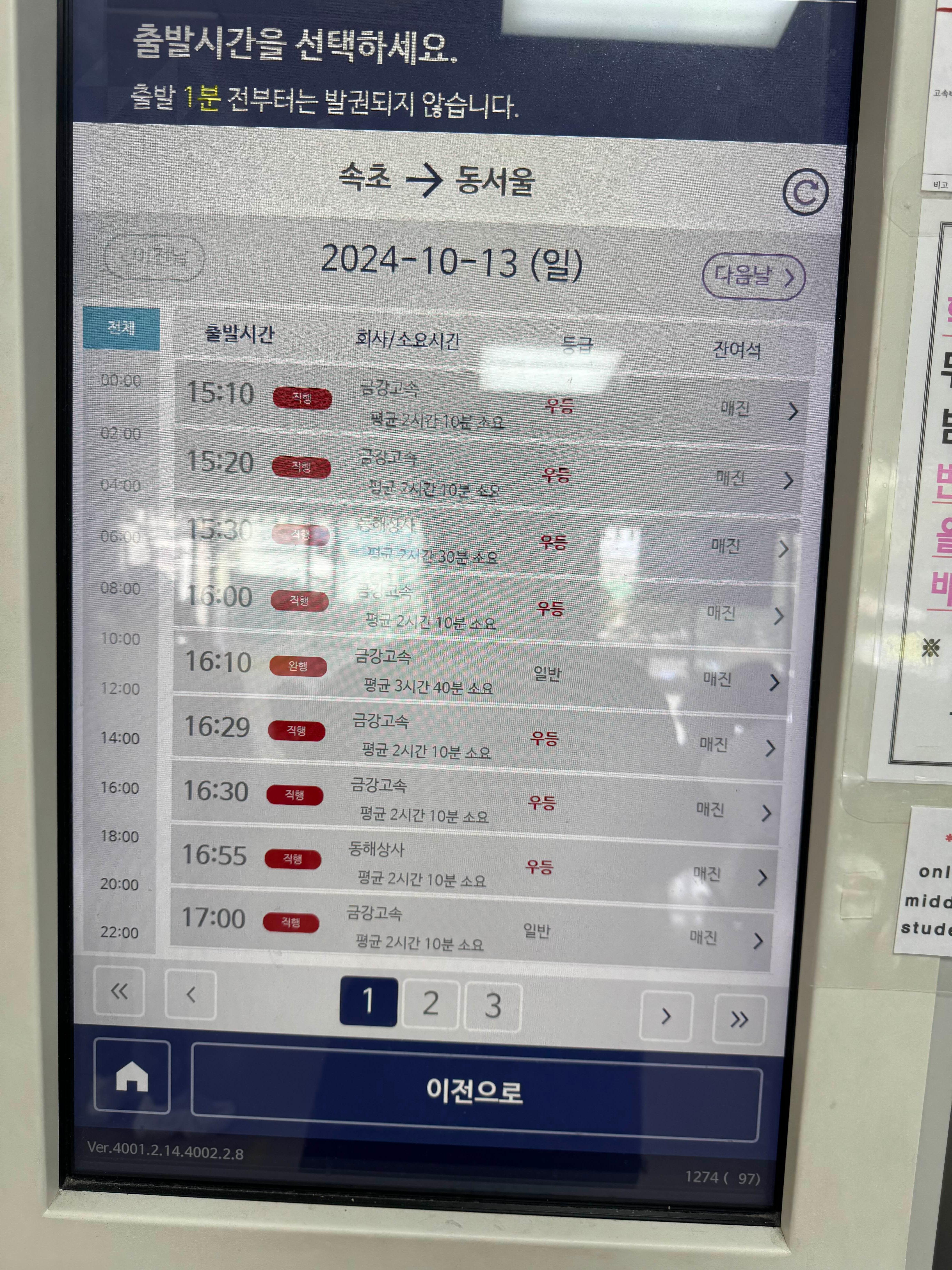 그리고 속초 터미널로 와서 동서울 터미널로 오는 표를 발권하려고 봤더니 모든 시간대가 매진이었다. 다친 것도 서러운데 집에도 못 가나 싶었는데 15시 10분에 출발하는 버스가 15시 8분에 갑자기 빈 좌석이 생겨서 후다닥 예매하고 어찌어찌 서울로 돌아왔다. 남은 구간은... 흠... 쩝.
