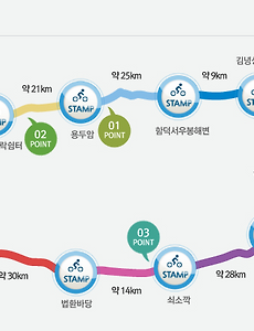 국토종주 아라자전거길 ※ 코스 요약 거리 : 21km 난이도 : ★☆☆☆☆ 국토종주 코스 중 가장 쉬운 코스입니다. 오르막이 없는 평지 위주의 코스이고 보급할 장소도 아주 많기 때문에 주변 경치를 감상하며 쉬엄쉬엄 달린다면 누구나 무리 없이 달릴 수 있습니다. 주말에는 놀러 나온 사람들이 많기 때문에 사람에 주의하면서 달려주세요. 아라자전거길 인증센터 ※ 아라서해갑문 (식당, 편의점, 화장실, 카페, 유인인증센터) ※ 아라한강갑문 (화장실, 자판기, 푸드트럭(없을 수도 있음)) 아라자전거길 코스안내 아라자전거길은 자전거도로 내 편의시설(매점, 화장실 등)이 매우 잘 되어 있어 따로 표기하지 않습니다. 다만, 태풍이나 장마 등의 기간에는 기상요건 등의 사유로 폐쇄되거나 없어질 수 있습니다. 물론, 그럴 때..